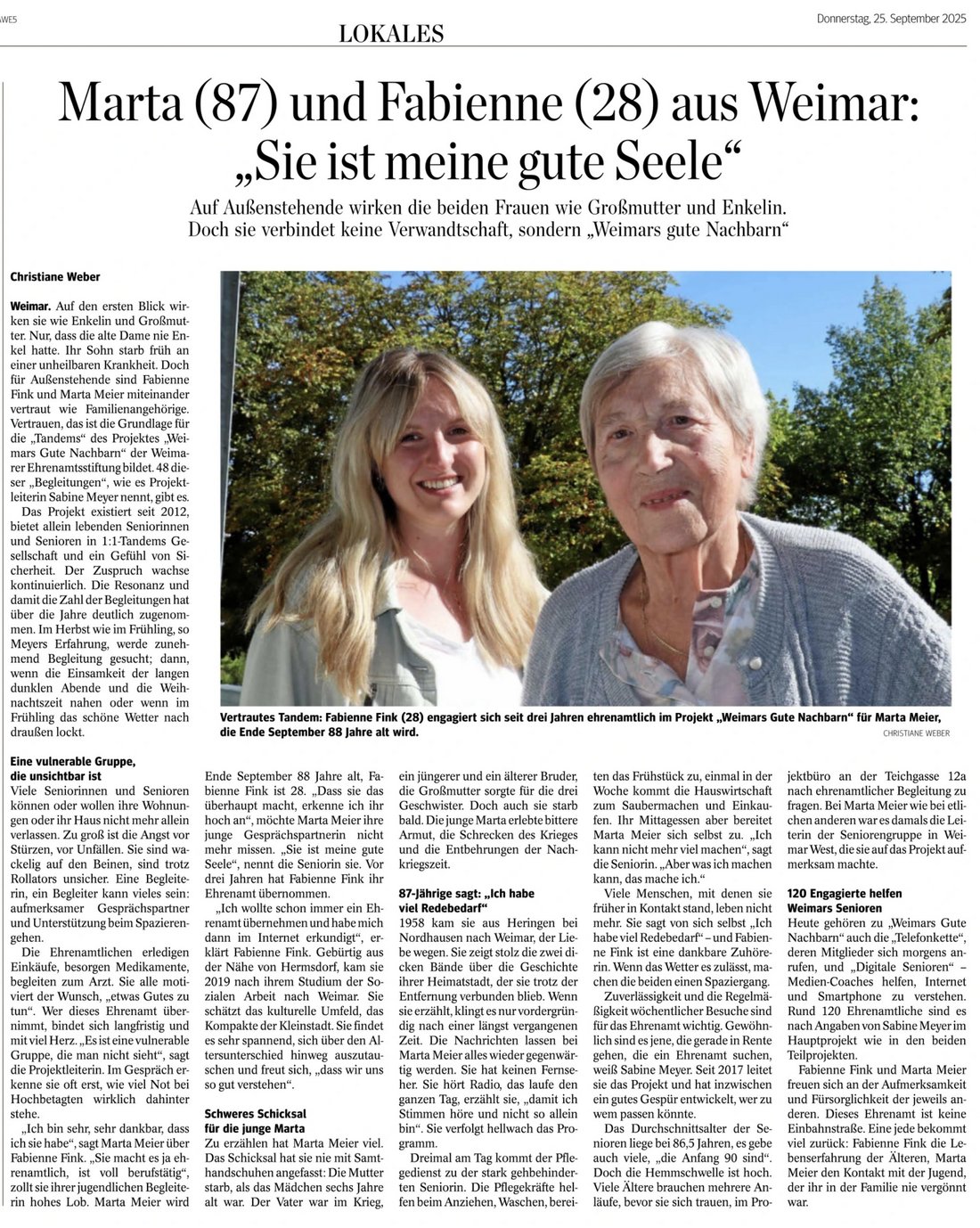 Auf Außenstehende wirken die beiden Frauen wie Großmutter und Enkelin. Doch sie verbindet keine Verwandtschaft, sondern „Weimars gute Nachbarn“ - Artikel von Christiane Weber (TLZ, 25.8.25)